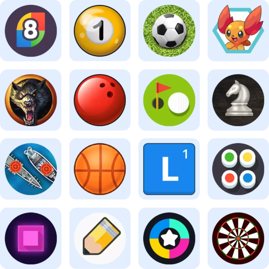 منچ ، مارپله ، کارت بازی شطرنج ، گلف فوتبال ، بسکتبال نقاشی ، دارت ، مافیا بیلیارد ، نقطه بازی ، بولینگ و غیره.